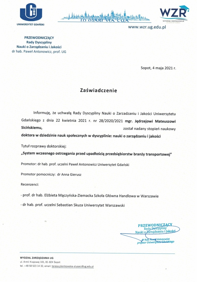 Na podstawie par. 8 ust. 1 Regulaminu Studiów Podyplomowych w Uniwersytecie Gdańskim (tekst jedn. załącznik do zarządzenia nr 57/R/16 Rektora Uniwersytetu Gdańskiego z dnia 30 czerwca 2016 r., ze zm.), dr hab. Paweł Antonowicz, prof. nadzw. z dniem 27 czerwca 2019 r. został powołany na stanowisko Kierownika Międzywydziałowych Podyplomowych Studiów przygotowujących do uzyskania stopnia naukowego doktora w dyscyplinach „Ekonomia i finanse” oraz „Nauki o zarządzaniu i jakości”, prowadzonych wspólnie przez Wydział Zarządzania i Wydział Ekonomiczny Uniwersytetu Gdańskiego.