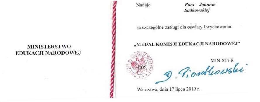 Podczas uroczystej inauguracji roku akademickiego 2019/2020, która odbywała się w dniu 2 października 2019 r. dr Joanna Sadkowska otrzymała Medal Komisji Edukacji Narodowej nadany za szczególne zasługi dla oświaty.
