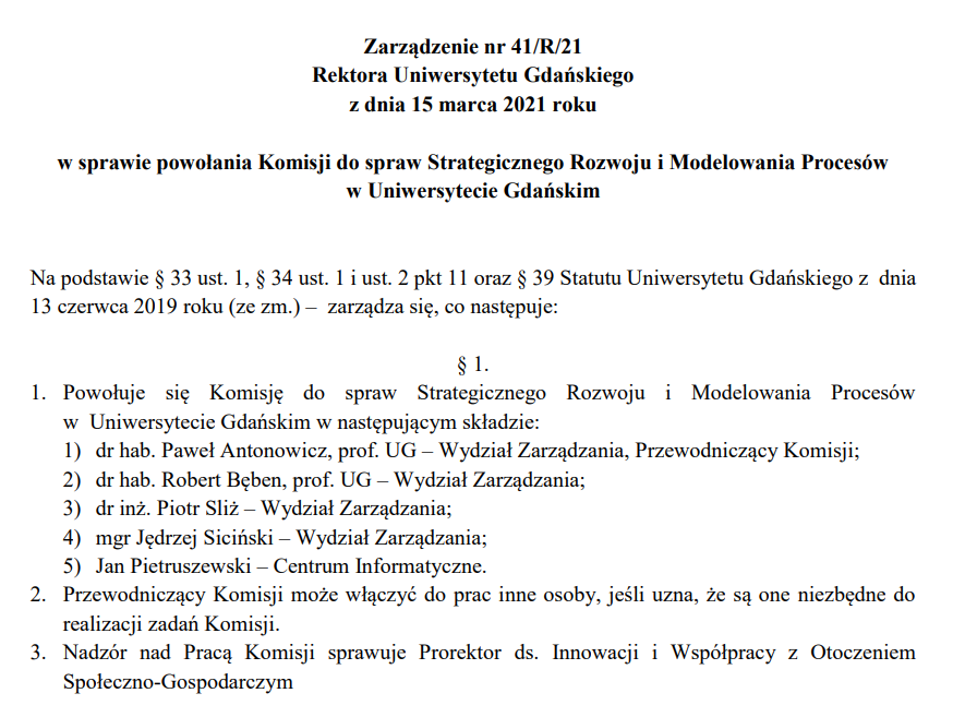 Na podstawie art. 200 ust. 2 ustawy – Prawo o szkolnictwie wyższym i nauce (Dz. U. z 2018 r. poz. 1668 ze zm.) oraz par 6 ust. 1 i 2 pkt 1 uchwały nr 57/19 Senatu Uniwersytetu Gdańskiego z 25 kwietnia 2019 roku w sprawie zasad rekrutacji do szkół doktorskich Uniwersytetu Gdańskiego w roku akademickim 2019/2020 powołany został dr hab. Paweł Antonowicz, prof. nadzw. na Członka Komisji Rekrutacyjnej do Szkoły Doktorskiej Nauk Humanistycznych i Społecznych – dziedzina nauk społecznych na rok akademicki 2019/2020.